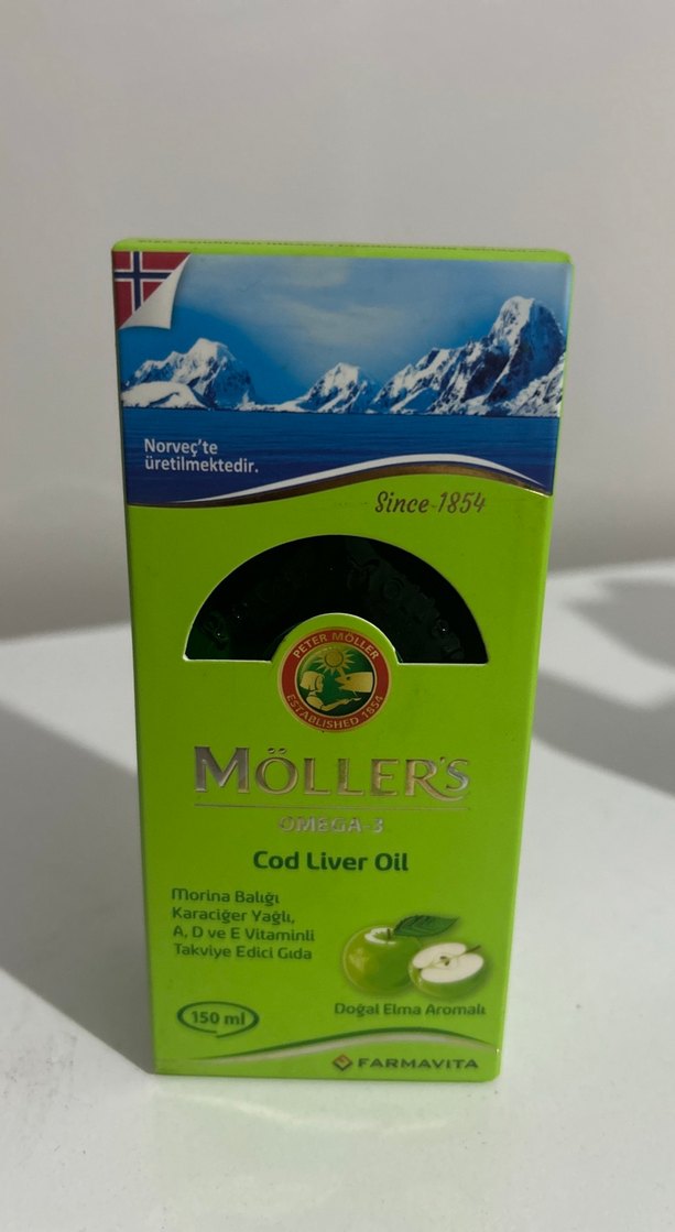 Möller's Omega 3 morina balığı karaciğer yağı, doğal elma aromalıdır. A, D ve E vitaminleri içerir. Norveç'te 1854'ten beri üretilmektedir.