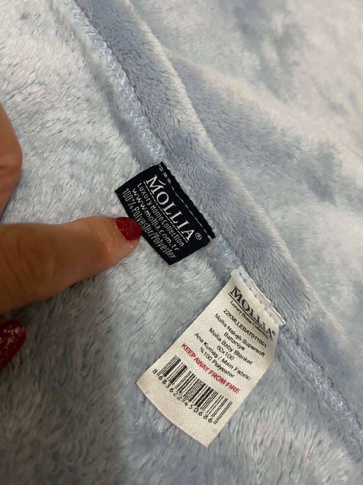 Mollia markalı ürün, %100 polyesterden üretilmiş yumuşak dokulu kumaş. Bakım talimatları mevcut, ateşten uzak tutunuz.