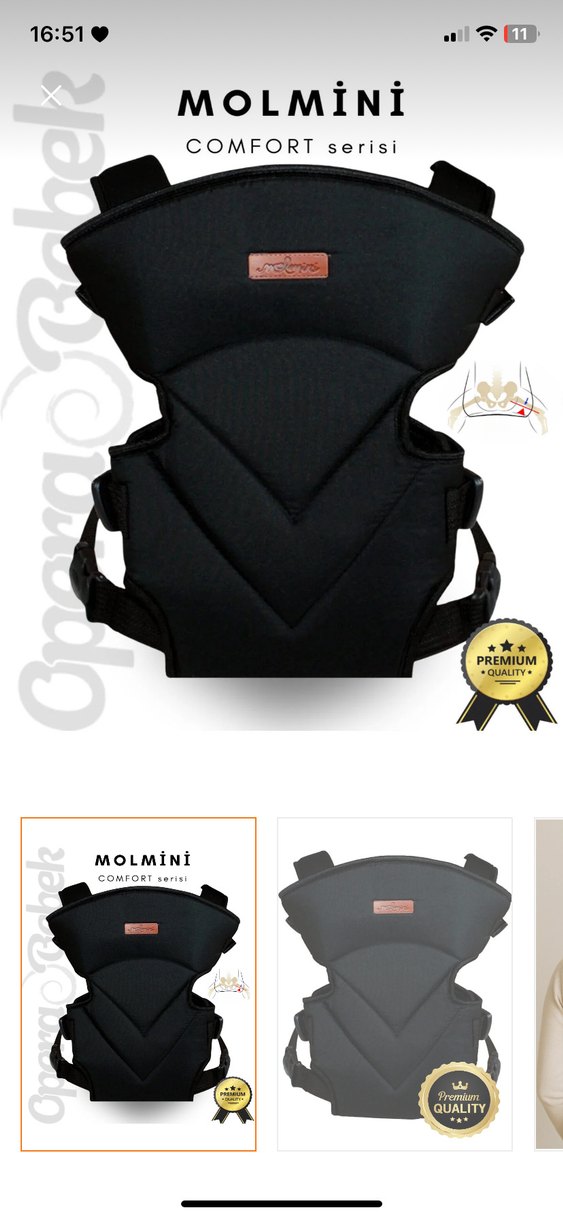 Ayarlanabilir kayışlı, ergonomik tasarımlı siyah bebek taşıyıcı. Premium kalite malzeme ve MOLMINI markası ile. Sorunsuzdur. Orjinal fiyat ektedir. #bebekkanguru #kanguru