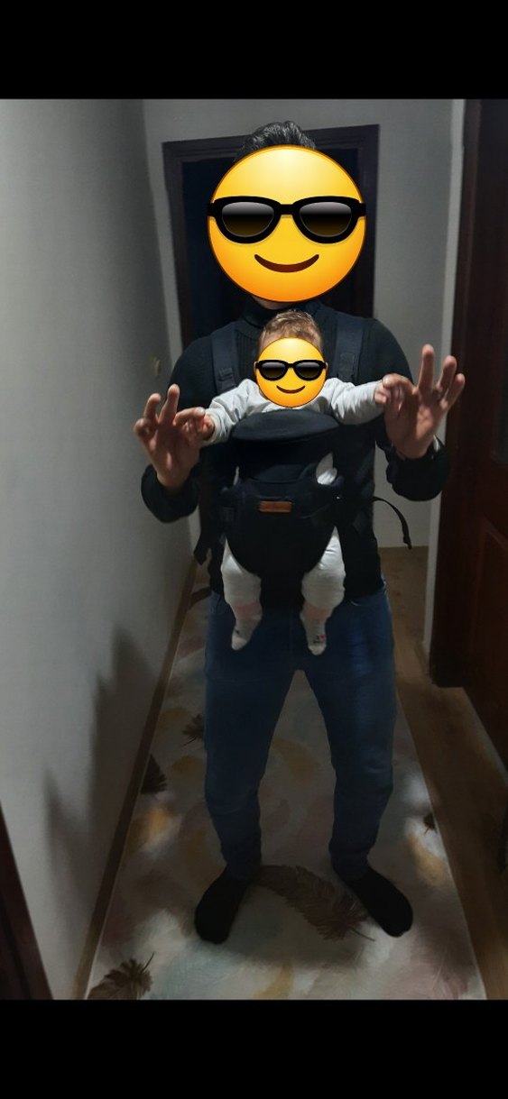 Ayarlanabilir kayışlara ve konfor için yastıklı desteğe sahip siyah bebek taşıyıcı. Bebeğinizi güvenli ve rahat taşımanızı sağlar.