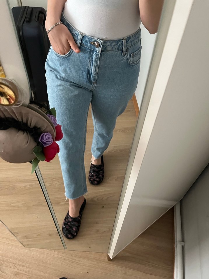 Bol kesim, normal boyda pastel mavi renkte kot pantolon. Tokalı detayıyla günlük kullanıma uygun rahat normcore tarzı. Boyu 90 cm benim boyum 1.58 marka temsili
