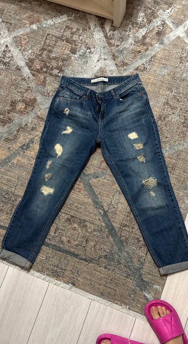 Mavi renkli, gri yıpranmış detaylara sahip rahat kesim kot pantolon. Midi boy ve yırtık tasarımıyla sokak stiline uygun.