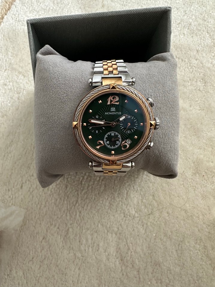 Altın ve gümüş renkli tokalı kayışı ve koyu yeşil kadranı ile modern klasik tasarıma sahip kadın saati. Şık detaylar ve kronograf fonksiyonları sunar. ⌚