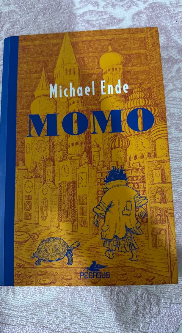 Michael Ende'nin Momo adlı eseri, Pegasus yayınevi tarafından basılmış, saatlerle dolu bir şehirde karakter ve kaplumbağa çizimi bulunan bir anı kitabı. ⏰