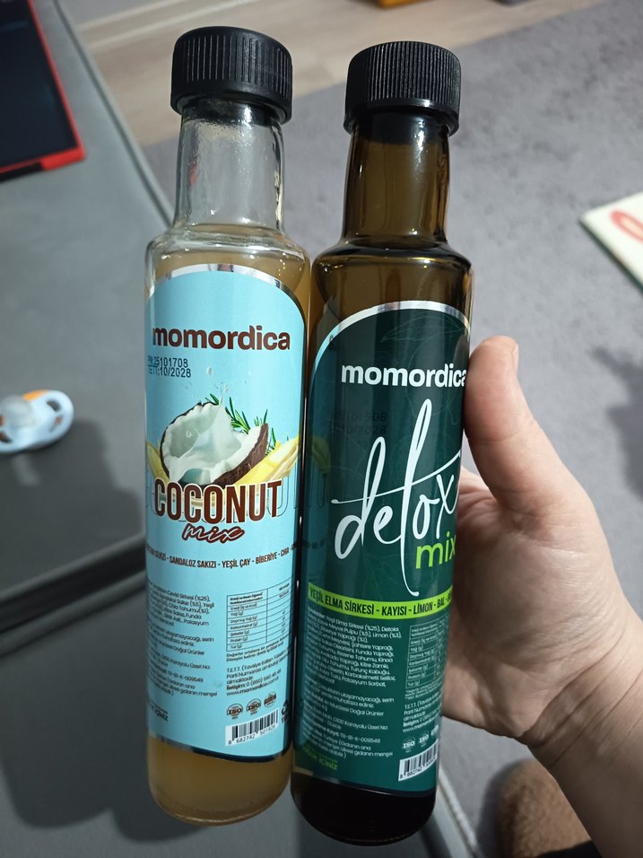 Momordica detoxs seti, hindistan cevizi ve detoks karışımlarından oluşur. Her biri siyah kapaklı şişede, tropikal ve özelliklere sahiptir.