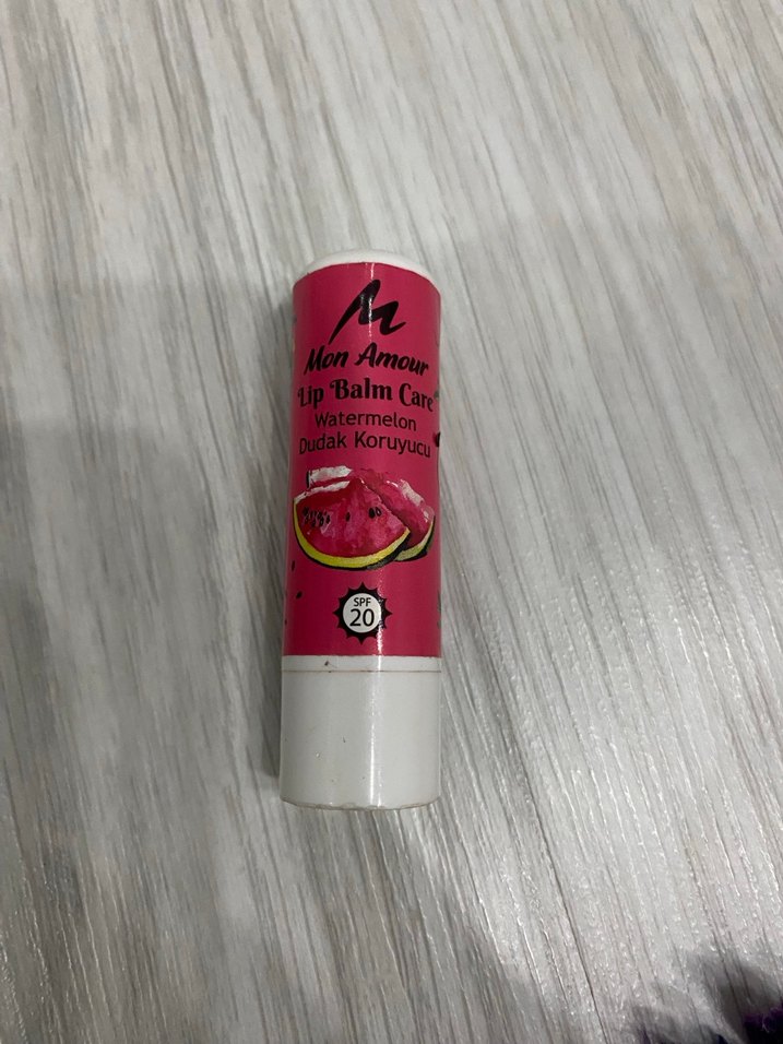 Mon Amour karpuz aromalı, renkli pembe tüpte dudak koruyucu stick, SPF 20 koruma sağlar.