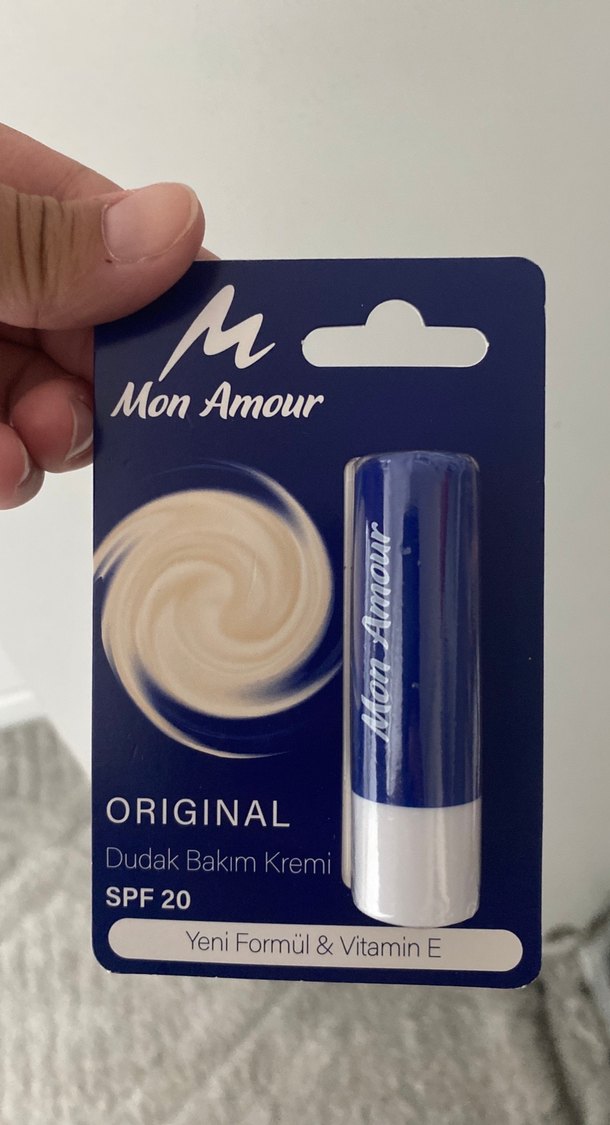Mon Amour markasına ait, parlak mavi renkte SPF 20 korumalı dudak bakım kremi. Yeni formül ve Vitamin E içerir.