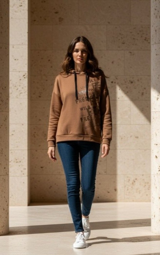 orjinal markadır yurt dışı ürünüdür Kahverengi kapüşonlu sweatshirt, bol kesim, uzun kollu ve baskılı detaylara sahiptir. modal kmş çekmez solmaz m.l xl bedene olur salaş dökümlü şık bir model iki kol arası en 58 boy 59 cm