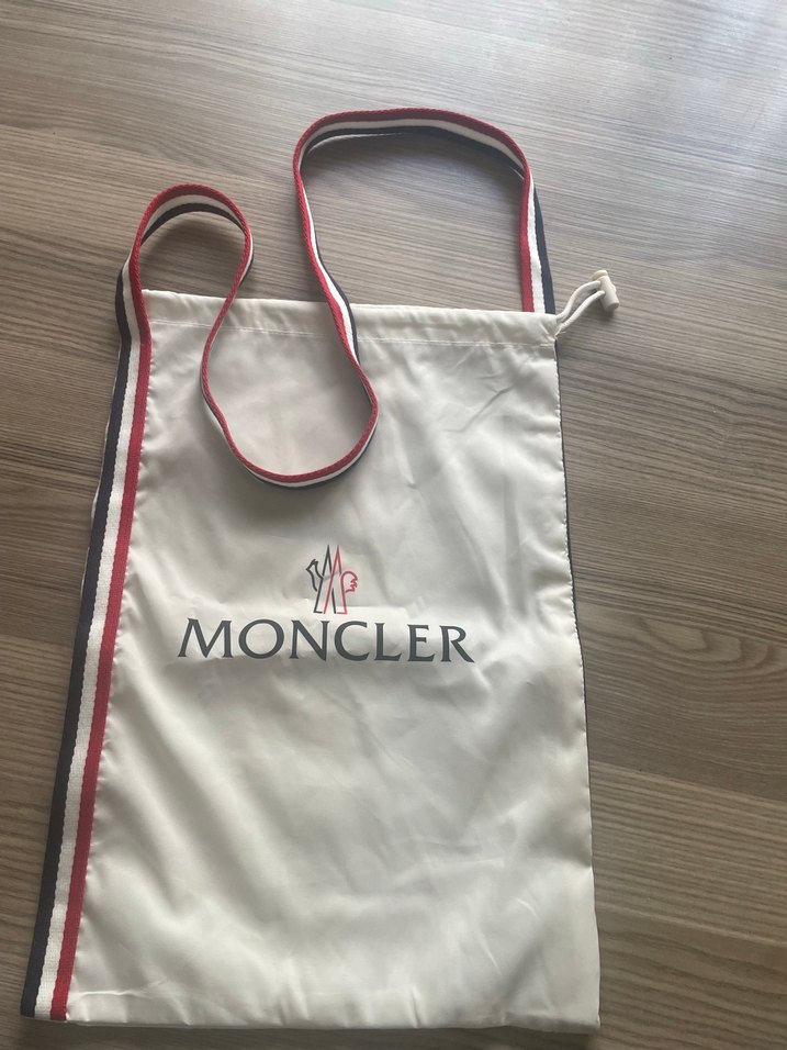 Moncler markalı, beyaz baskılı sentetik kumaştan yapılmış, fermuarlı kapamalı ve şeritli askılı kadın çantasıdır.