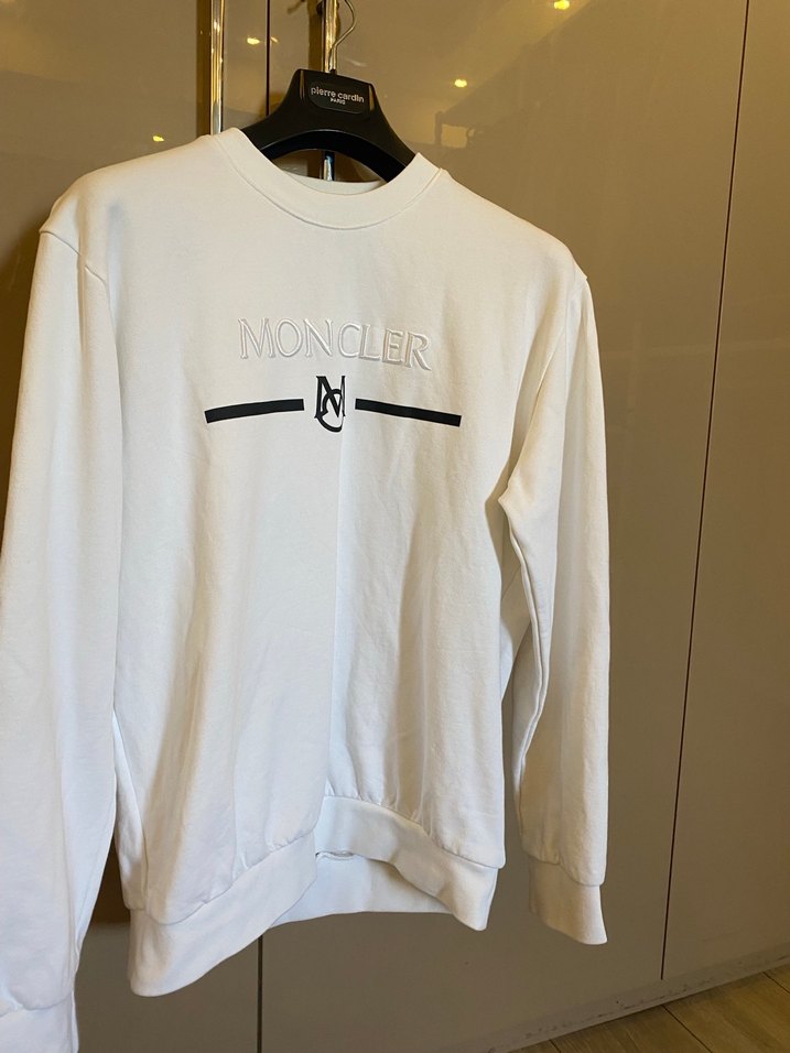 Moncler baskılı, beyaz crew neck, uzun kollu sweatshirt. Yumuşak ve sıcak kumaştan, rahat kesimle günlük kullanıma uygun.