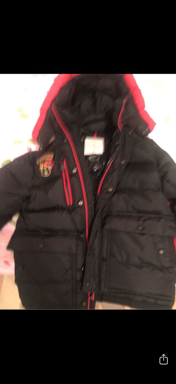Erkek çocuklar için düğmeli, yakası kesimli, siyah ve kırmızı detaylı, yumuşak ve sıcak kumaştan yapılmış baskılı kapüşonlu kaban.