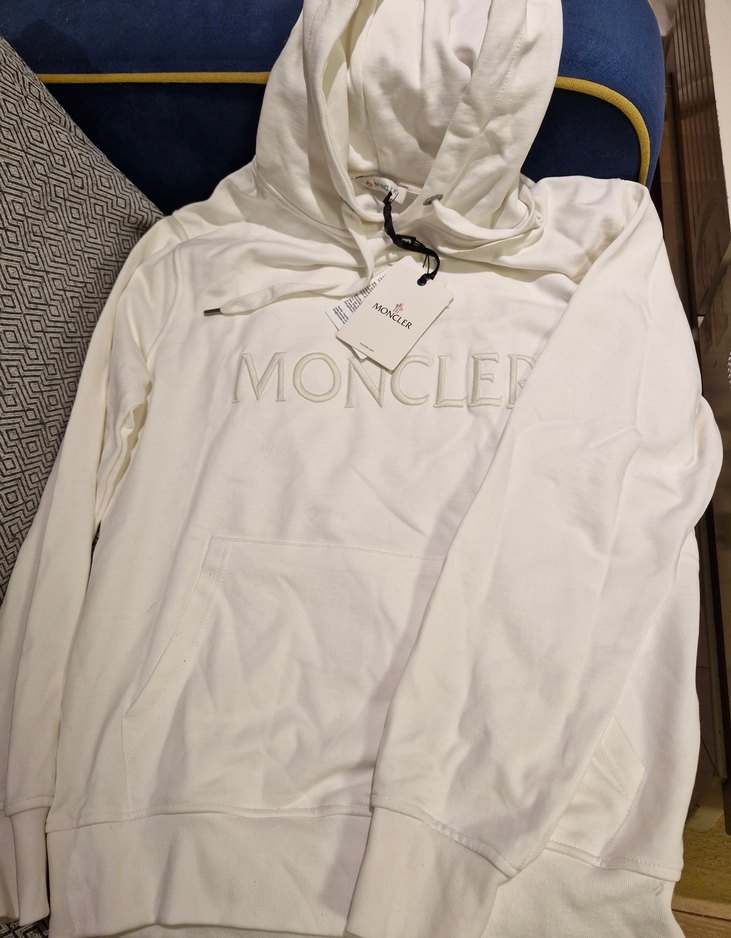 Moncler erkek beyaz kapüşonlu sweatshirt, yuvarlak yakalı ve uzun kollu. Rahat kesim, fermuarlı detaylar ve baskılı logo soft kumaş ile athleisure tarzına uygun.