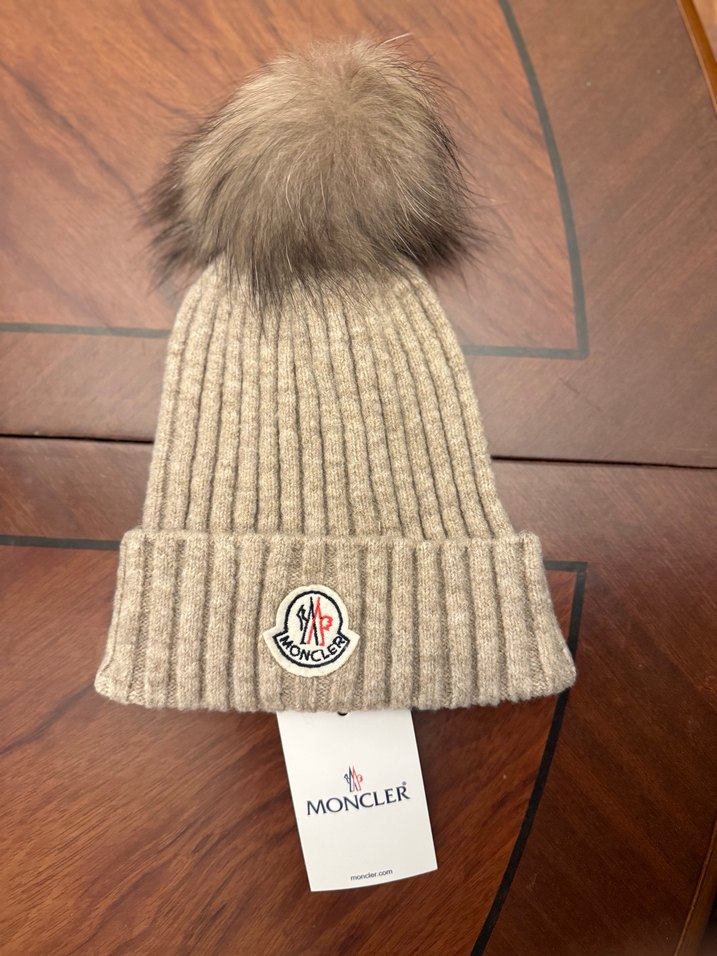 Moncler kadın bej rengi, yün örme bere, üstünde kürk detaylı ve manşette logo patch bulunur. Rahat ve şık sokak stili için uygundur. ❄️