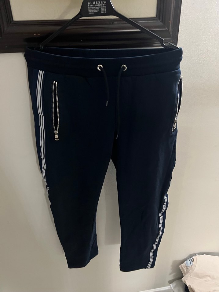 Lacivert, fermuarlı cepleri ve yan çizgileri olan, yumuşak ve sıcak kumaştan yapılmış erkek eşofman altı. ♂️