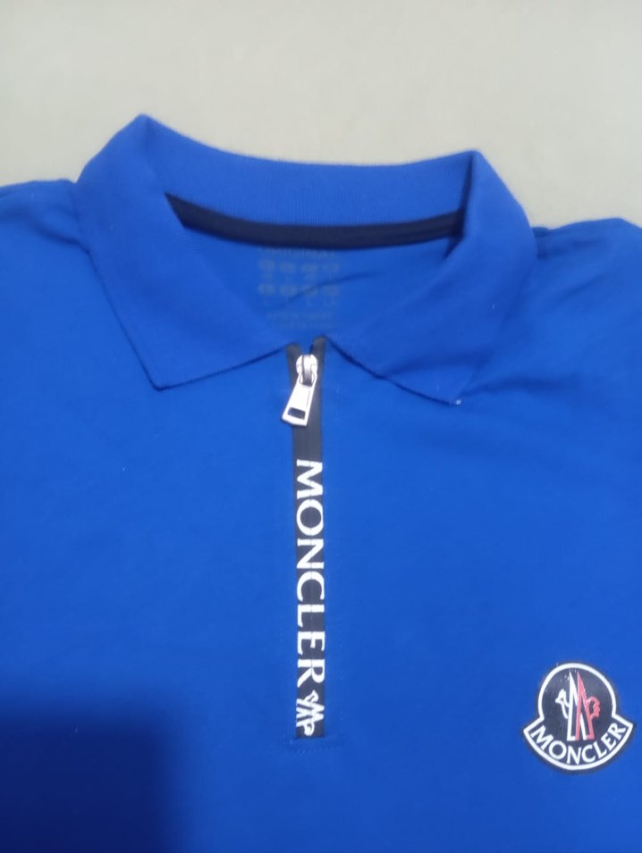 Moncler markalı, fermuarlı ön detaylı, kısa kollu, mavi renkli erkek polo tişört. Yumuşak ve sıcak kumaştan, rahat kesimli ve baskılı logo ile günlük kullanıma uygun.