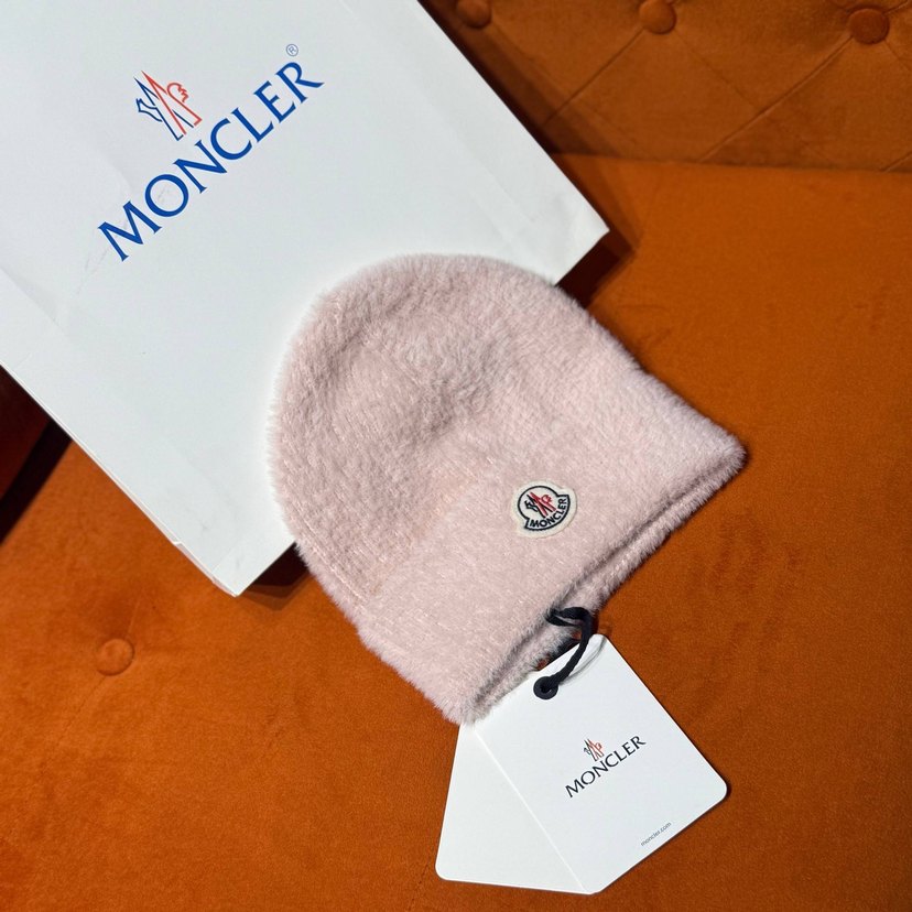 Moncler marka, yumuşak ve sıcak kumaştan örülmüş pembe kadın bere. Sokak tarzına uygun, Moncler logosu ve orijinallik etiketi bulunur.