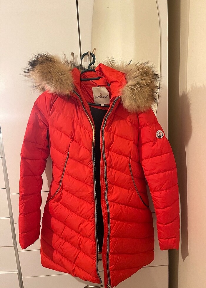 Moncler s beden kırmızı temiz az kullanılmış mont sadece sağ fermuar yerinde resimde de gözüküyor bir soyulması var