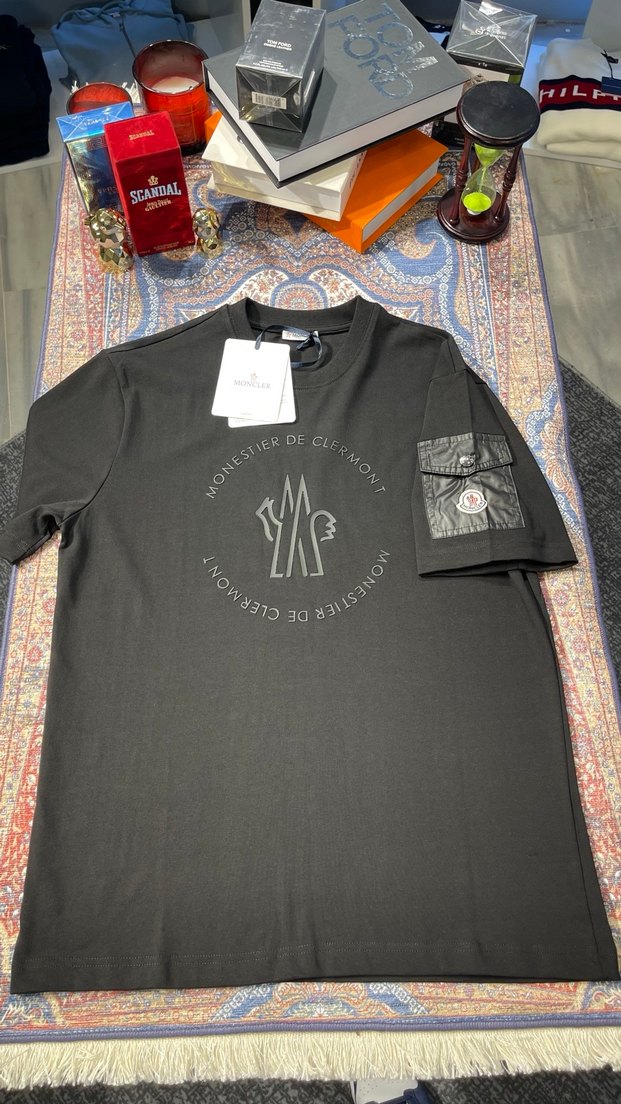 ÜRÜNLERİN BEDENLERİ: S,M,L,XL,XXL MEVCUTTUR Moncler siyah tişört, önünde baskılı logo ve kollarda küçük cepli detay. Oversize kesim, kısa kollu ve yuvarlak yaka, rahat sentetik kumaştan üretilmiştir.