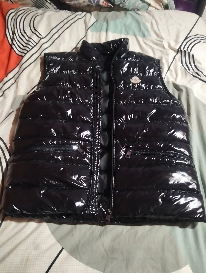 Moncler siyah, düğmeli, yüksek yakalı, şişme ve fitted kesim Unisex yelek. Parlak dokusu ve midi boyu ile günlük rahat sokak stiline uygun.