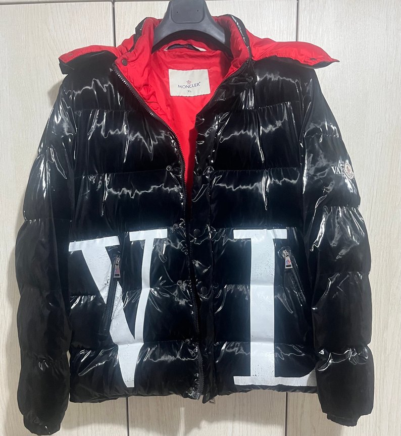 Moncler valantino, parlak siyah erkek mont, büyük beyaz baskılarla. Notlu yaka ve uzun kollu, günlük sokak stiline uygun, dar kesim.