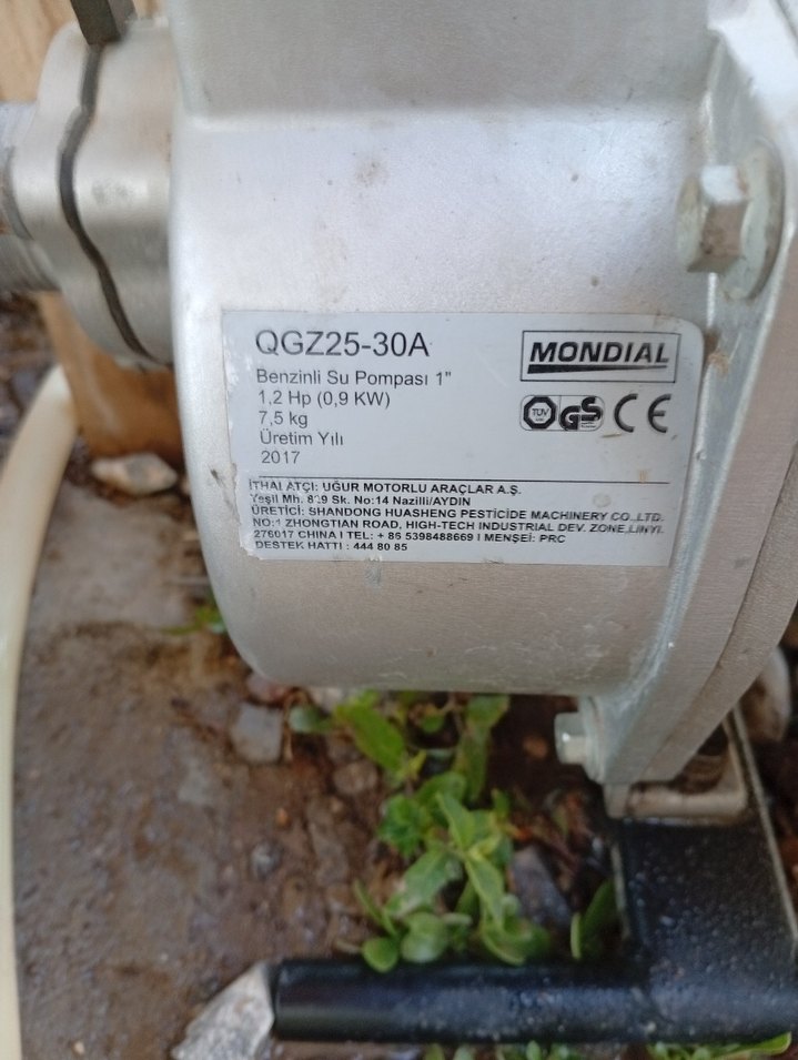 Gri renkte, 2017 üretimi Mondial benzini su pompası, 1.2 Hp (0.9 KW) güç ve 7.5 kg ağırlığındadır. Su pompalama için uygundur.