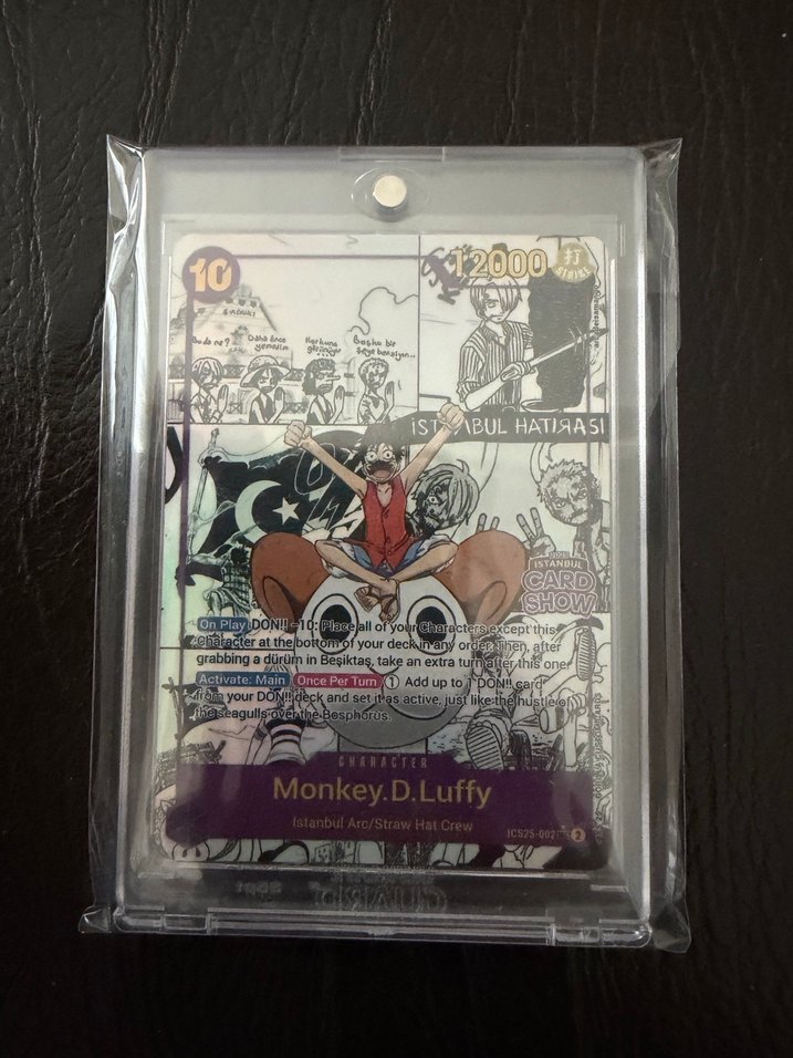 Monkey. D. Luffy One Piece İstanbul Card Show Promo Kartı. 2025 yılında düzenlenen İstanbul Card Show organizasyonunda dağıtılan promo paketlerinden çok az oranda çıkan manga kartıdır. Koruyucu ile birlikte gönderilecektir.