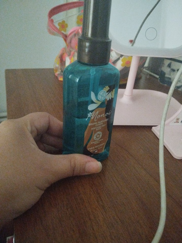 Mavi şişede, çiçek desenli Monoi kadın parfüm spreyi, ferah ve hoş koku sağlar. yarısına kadar dolu tam bir vanilya kokusu ve saç vücut parfümü olarak geçiyor mağazasından almıştım üç ay oluyor harika bir koku