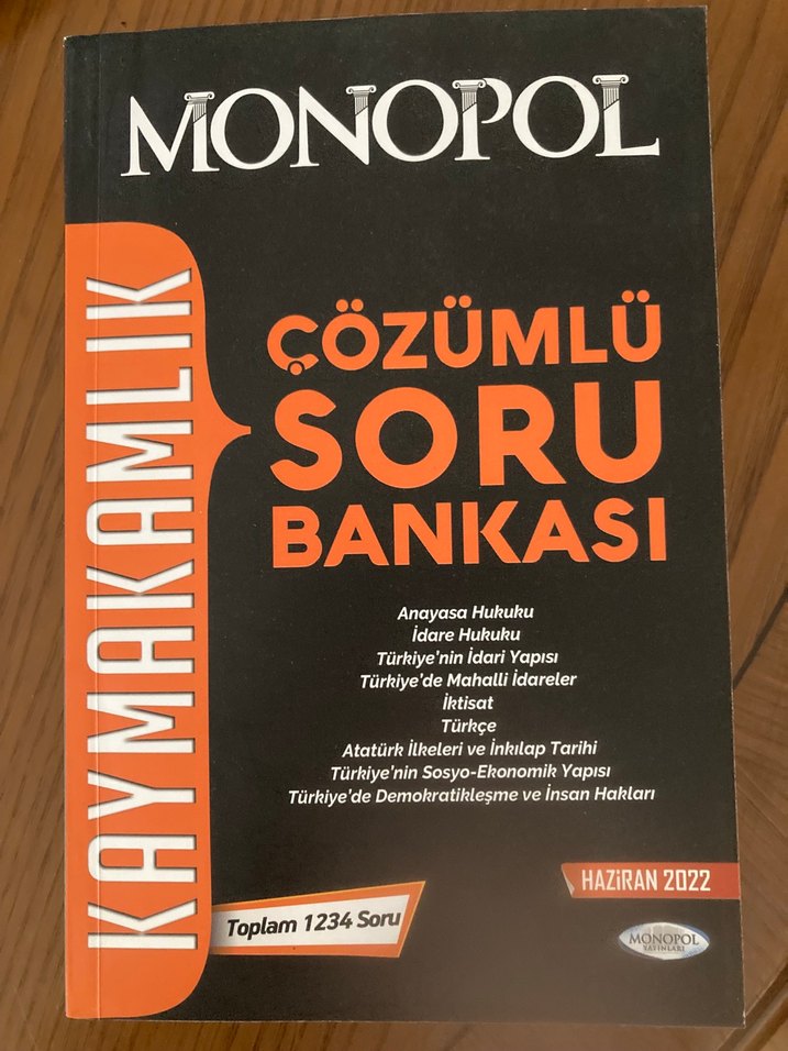 Monopol Kaymakamlık sınavı için 1234 çözümlü sorudan oluşan kitap; Anayasa Hukuku, İdare Hukuku, Türkiye'nin sosyo-ekonomik yapısı, yerel yönetimler, ekonomi, Türkçe ve Atatürk ilkeleri tarihini içerir. Hiç kullanılmadı, işaretleme veya çizik yok. Temiz bir kitap.