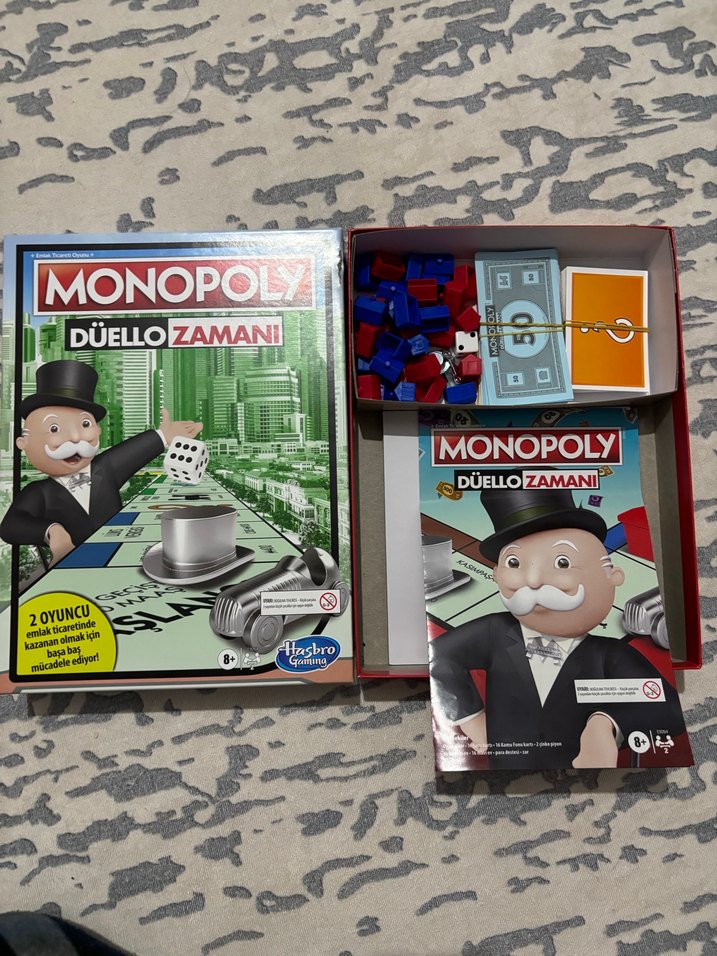 Monopoly Duello masa oyunu, renkli oyun tahtası, kartlar ve oyun paraları ile iki kişi için tasarlanmıştır. Farklı mülkler ve oyun parçaları içerir.