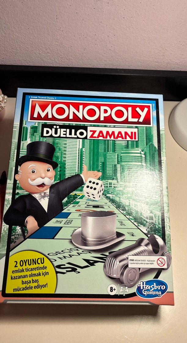 Monopoly Düello Zamanı, parlak gri renkte, oyuncuların ticaret yapıp karşılıklı mücadele ettiği bir masa oyunudur. 8 yaş ve üzeri için uygundur.