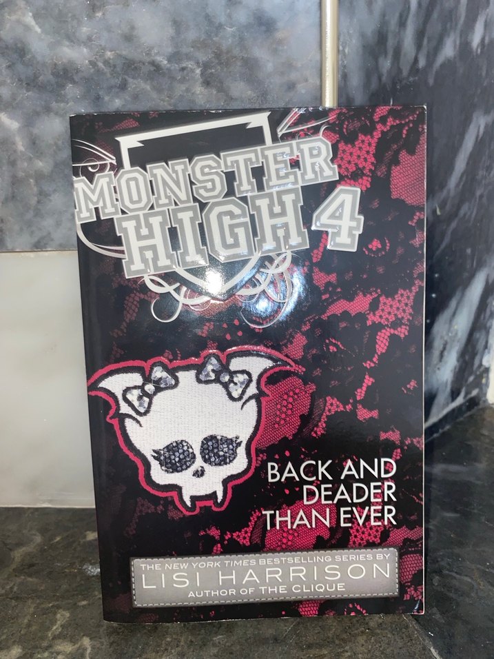 Monster High 4, Lisi Harrison imzalı 'Back and Deader Than Ever' adlı, kafatası figürlü koyu kapaklı popüler bir seri kitabı.
