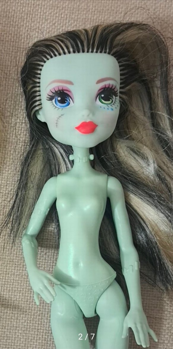 Pastel gri renkte, çok renkli gözlere ve parlak dudaklara sahip uzun saçlı, detaylı yüz tasarımlı bebek.