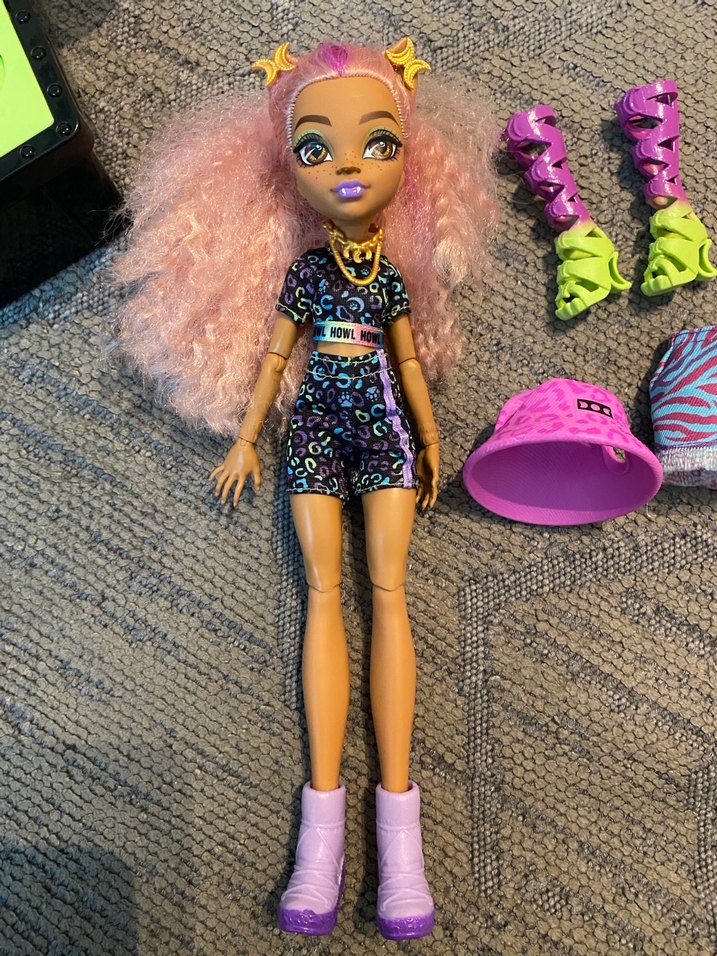 Pastel renkli bukleli saçlara sahip bebek, bot, şapka ve bacak ısıtıcıları gibi çoklu aksesuarlarla birlikte gelir. Renkli leopar desenli kıyafet giyer.