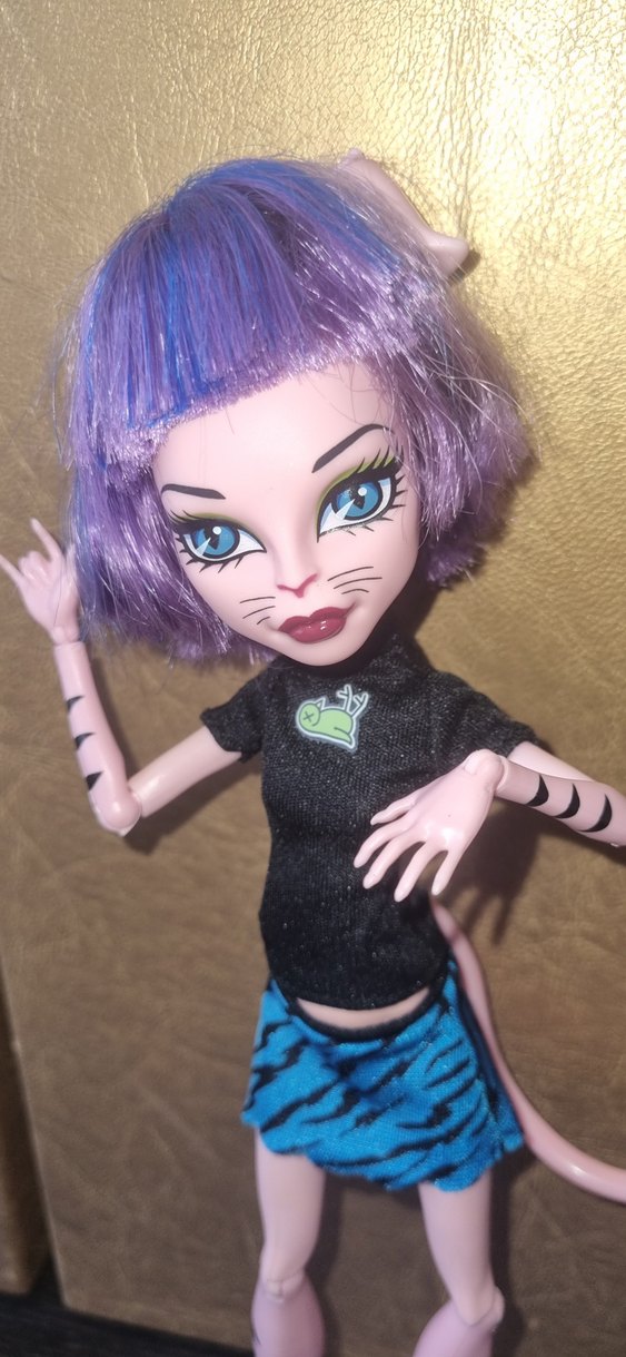 Monster High 11" Doll CAM CREATE A MONSTER DESIGN Pink Cat GIRL Monster High Doll CREATE A MONSTER DESIGN Pink Cat GIRL - temiz sorunsuz görüldüğü kadar ..2012 #MONSTER #monster #monsterhigh #monsterhighdollor saçlı, kedi temalı yüz detaylarına sahip bebek, siyah üst ve mavi desenli etek giymektedir.