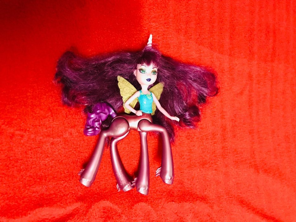 Mor saçlı ve çok bacaklı, periye ait kanatları ve tek boynuzlu at boynuzu olan çok renkli bir bebek. Temiz durumda