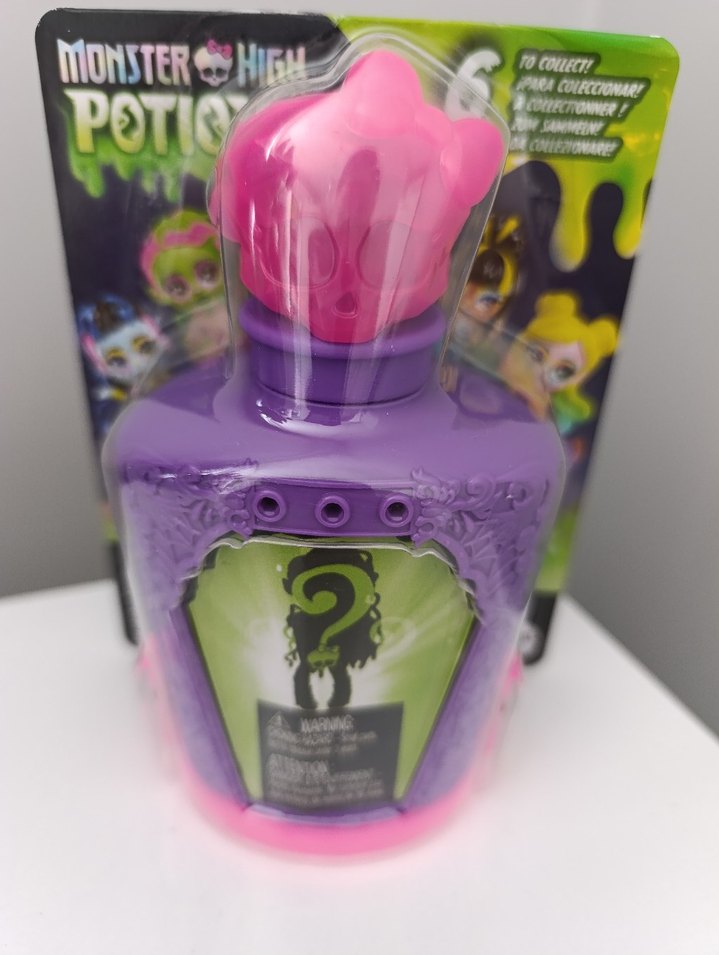 Monster High renkli mor şişe, pembe taç şeklinde kapak ve sürpriz toplanabilir parçalar içerir.