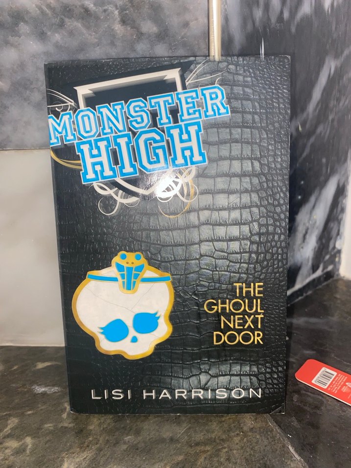 Lisi Harrison imzalı Monster High: The Ghoul Next Door kitabı, doku efekti ve kafatası simgesiyle okul ve korku temasını bir araya getiriyor.