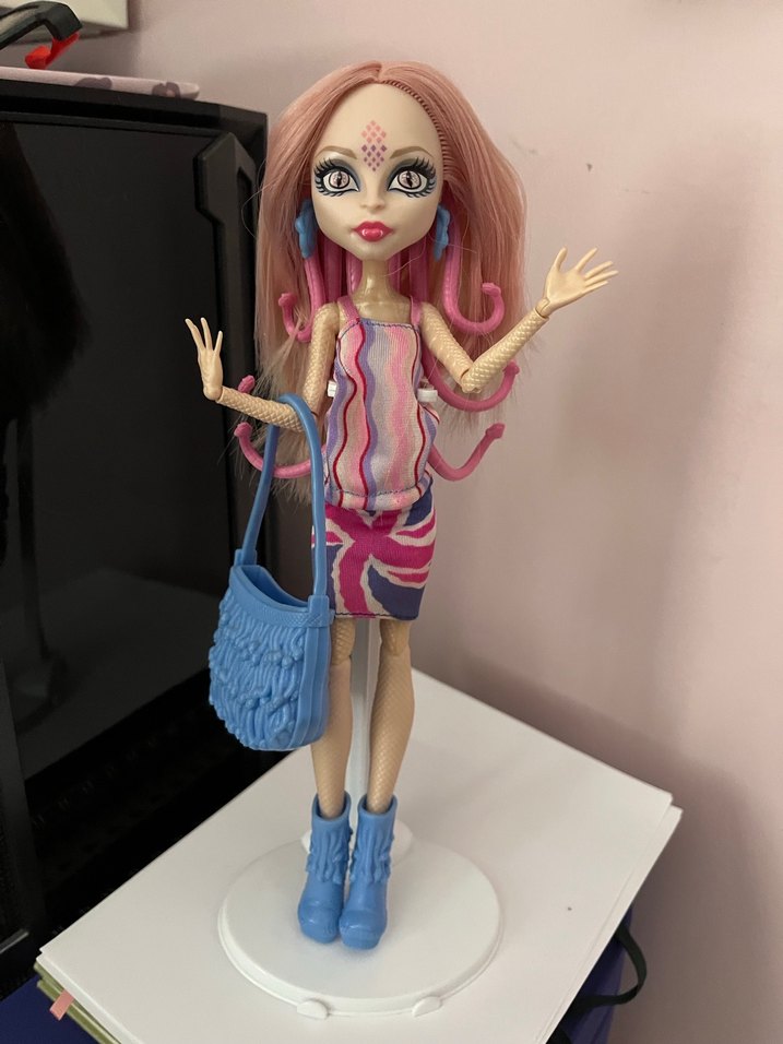 Eklemleri kusursuz sadece sergilendi Pembe saçlı bebek, pastel renkli çizgili elbise, mavi botlar ve uyumlu mavi çanta ile birlikte beyaz stand üzerinde duruyor.