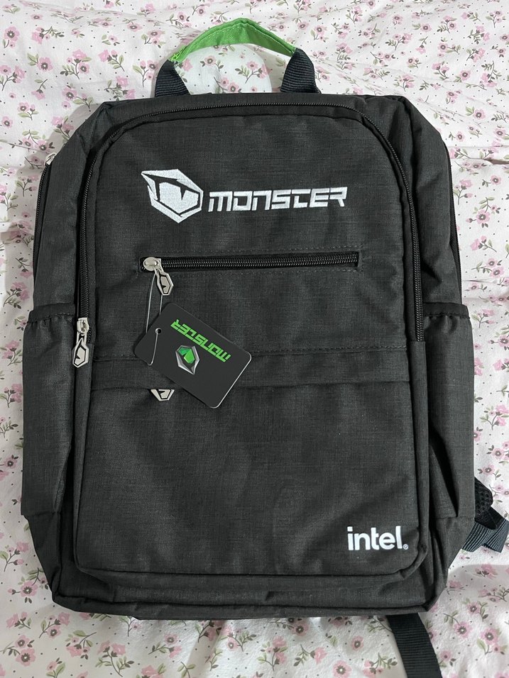 Çok bölmeli fermuarlı erkek sırt çantası, koyu renkli baskılı tasarıma ve yeşil detaylara sahiptir. Monster ve Intel markalıdır. ️