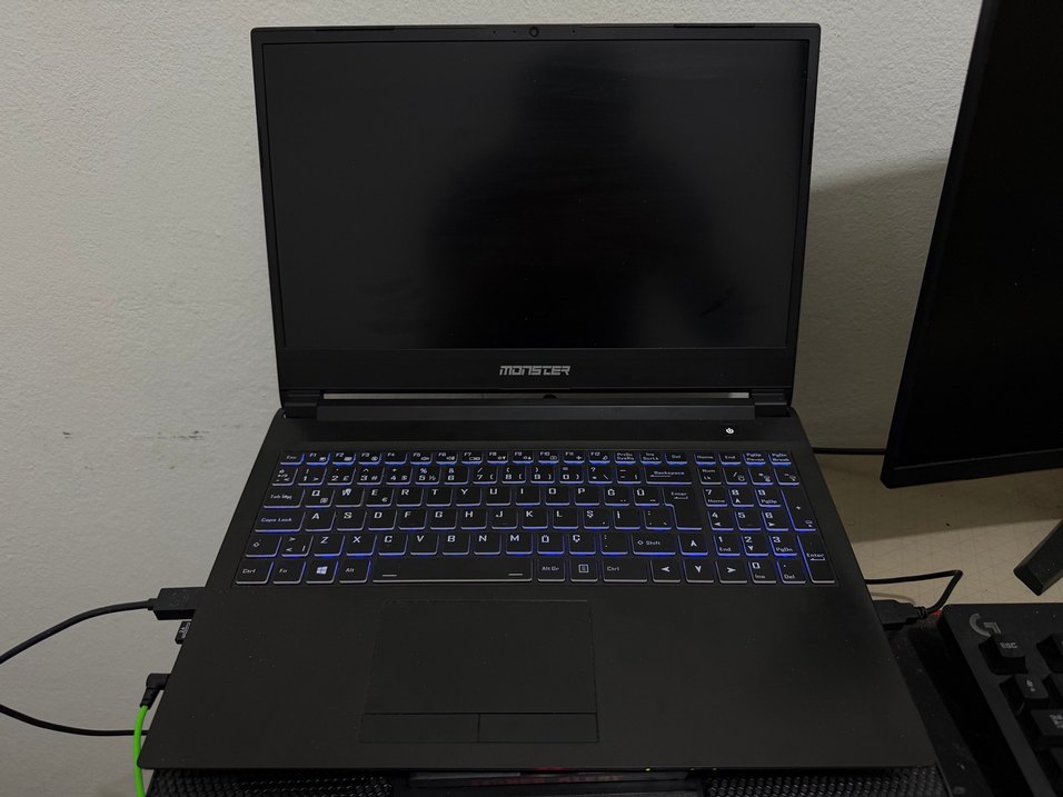 Klavyesi arkadan aydınlatmalı siyah laptop. Ekranın altında Monster markası yer alıyor. Düşük ışıkta kullanım için aydınlatmalı tuşlar mevcut.