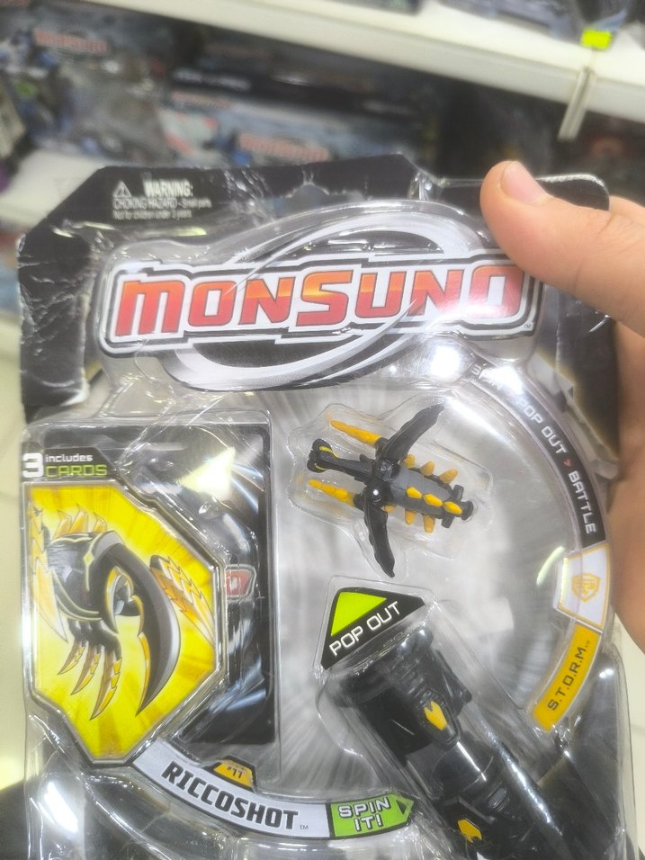 Monsuno Riccoshot aksiyon figürü, koyu sarı renkte, dönen aksesuar ve açılır savaş özelliği ile birlikte. 3 kart içerir. ⚔️