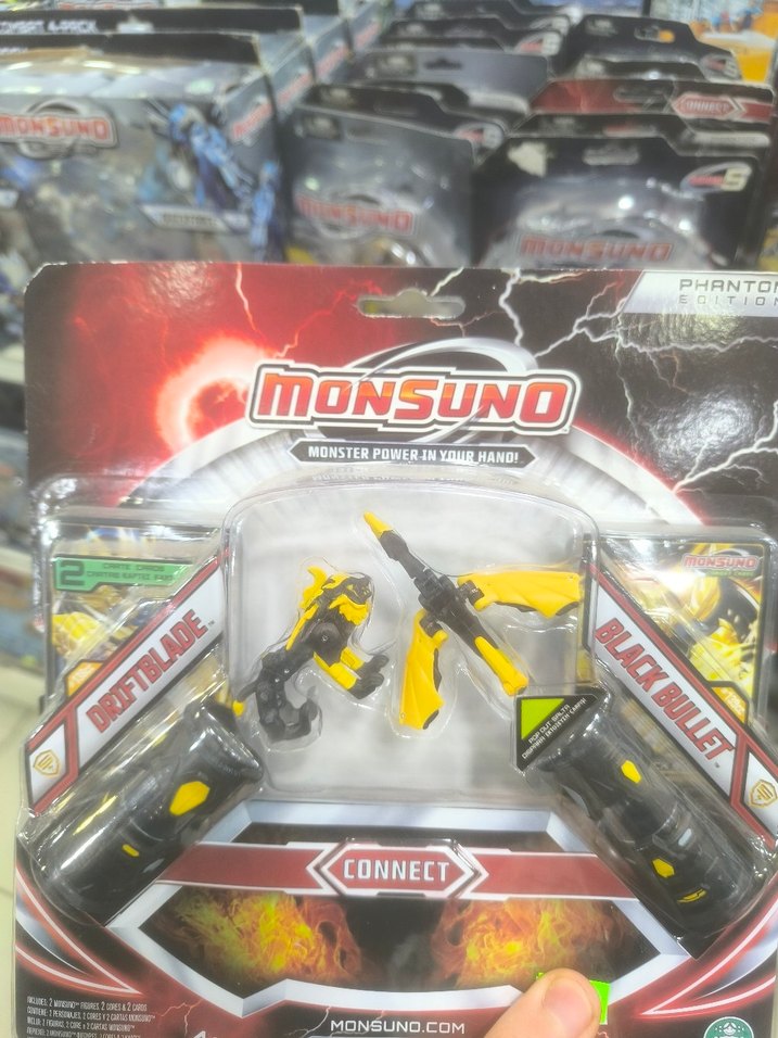 Monsuno markalı, sarı ve siyah renkli Driftblade ve Black Bullet adlı iki silah içeren aksiyon figürü seti. Canlı renk detaylarına sahip.