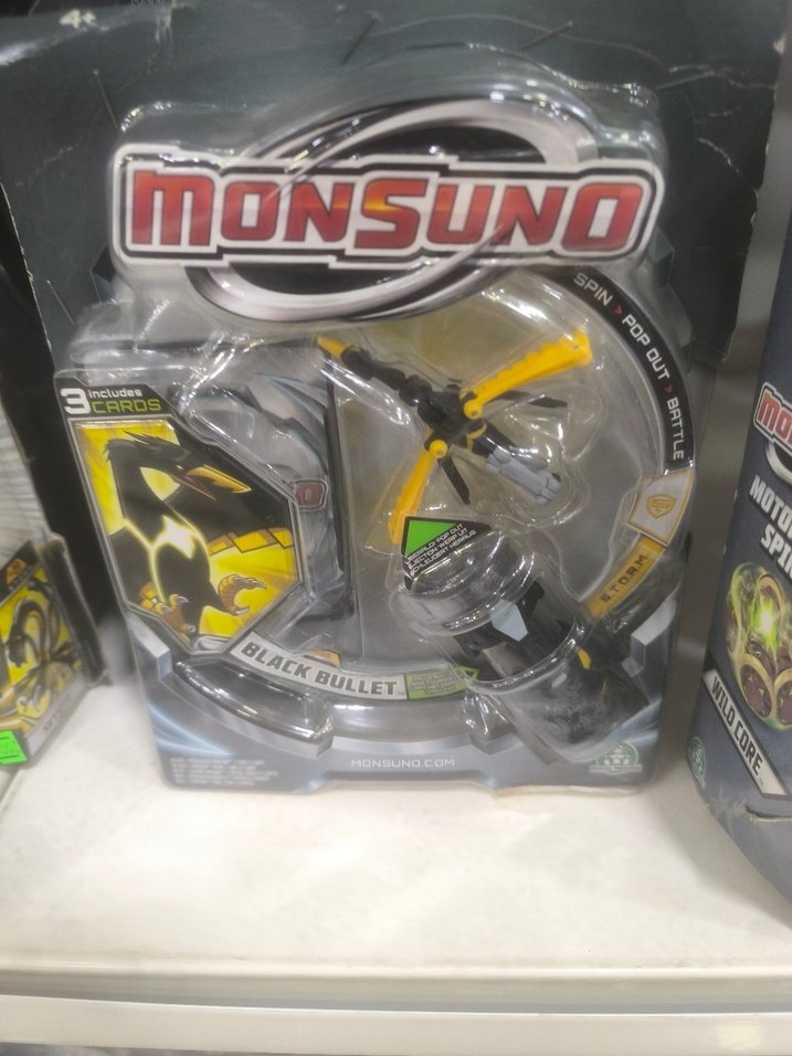 Monsuno Siyah Mermi aksiyon figürü, gri ve sarı renklerde, dönen ve açılabilir savaş özelliklerine sahip. 3 kart içerir.