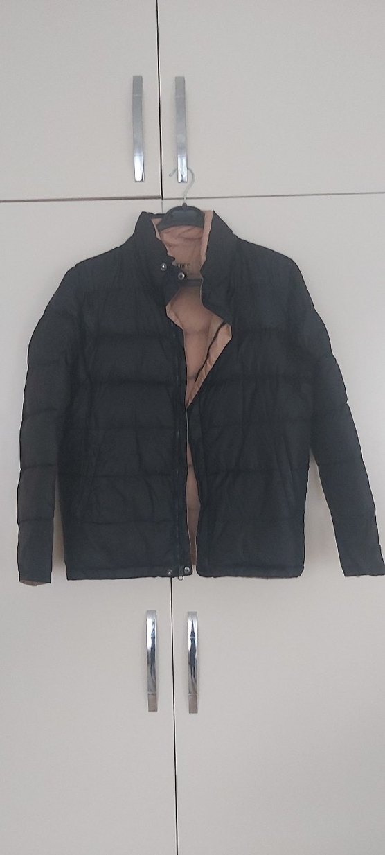 Erkekler için yüksek yakalı, fermuarlı ve uzun kollu siyah mont. Rahat ve sıcak tutan kumaştan, normal boyda ve dar kesimdir.