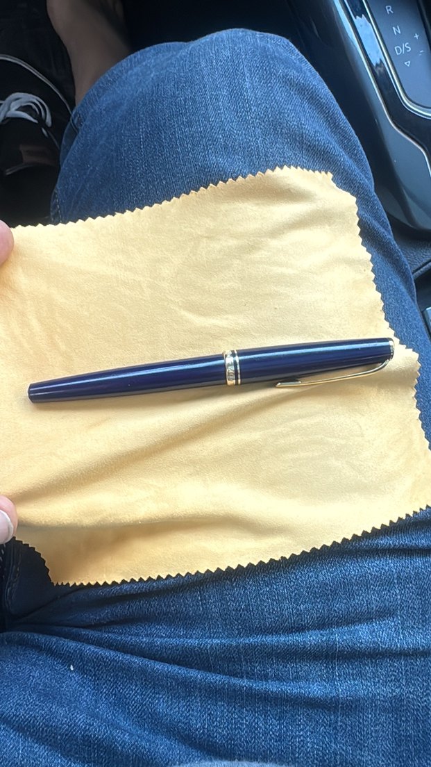 Parlak mavi renkte, metal klipsli şık tasarımlı dolma kalem, bej temizlik bezi üzerinde.