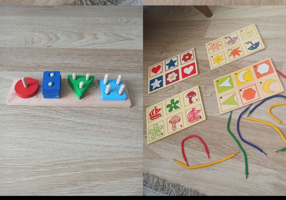 Bu çok renkli eğitici oyuncak seti, ince motor becerilerini ve yaratıcılığı geliştiren şekil eşleştirme ve ip geçirme bazı parçaları kaybolmuş ama hepsi işe yarar durumda. özellikle ip geçirme oyuncakları ince motor gelişimi için ideal. ipli renk eşleştirme oyunu 170lira. renkli şekilleri geçirme oyununun parçaları eksik olduğu için 75lira.
