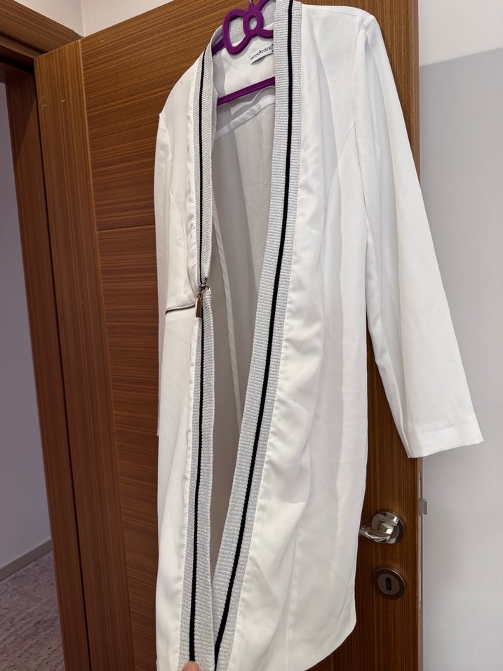Minimalist beyaz midi ceket, notched lapel yaka ve fermuarlı ön detayına sahiptir. Uzun kollu, regular fit ve sentetik kumaştan üretilmiştir. Boyu 92 cm