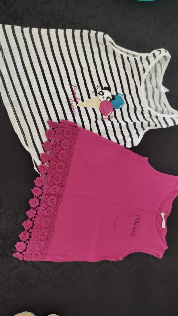 İki adet kız çocuk kolsuz tişört; biri dantelli ve küçük cepli pembe, diğeri çizgili ve renkli baskılı V-yaka. Pamuklu ve rahat.