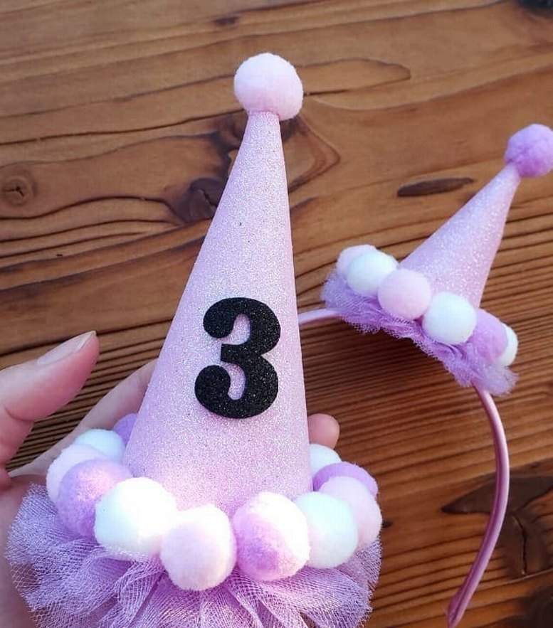 simli evadan Pastel mor renkte, 3 yaş , püsküllü ve yumuşak ponpon detaylı çocuk doğum günü taçı