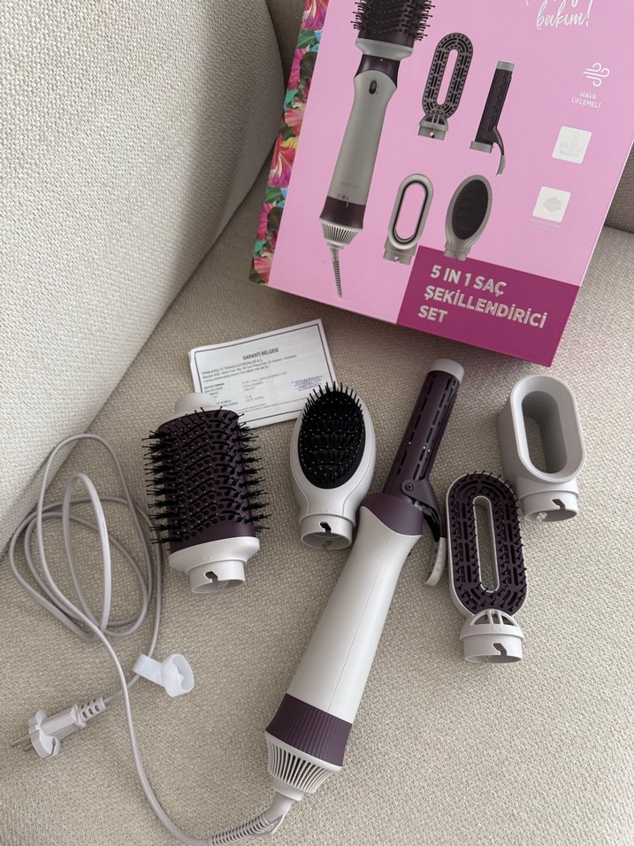 Mor renkli 5'li saç şekillendirici set, farklı şekillendirme seçenekleri için çoklu başlıklar içerir. Hafif tasarıma sahip ve kullanımı kolaydır. ♀️